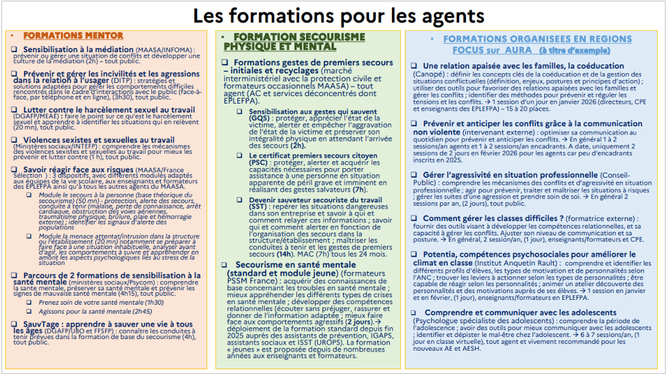La prévention passe par la formation. L’offre actuelle sur la plateforme Mentor comprend un module de base (« Savoir réagir face aux risques ») et des parcours spécifiques (santé mentale, gestion de conflits). L’Elan Commun a exigé que ces formations soient planifiées sur le temps de travail et en dehors des périodes de forte activité.